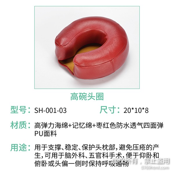 蒙泰手術體位墊系列中的高碗頭圈主要由高彈力海綿、記憶棉、棗紅色防水透氣四面彈PU面料組成,主要用于支撐、穩定、保護頭枕部,避免壓瘡的。如果您還想了解更多內容,歡迎咨詢蒙泰護理哦!