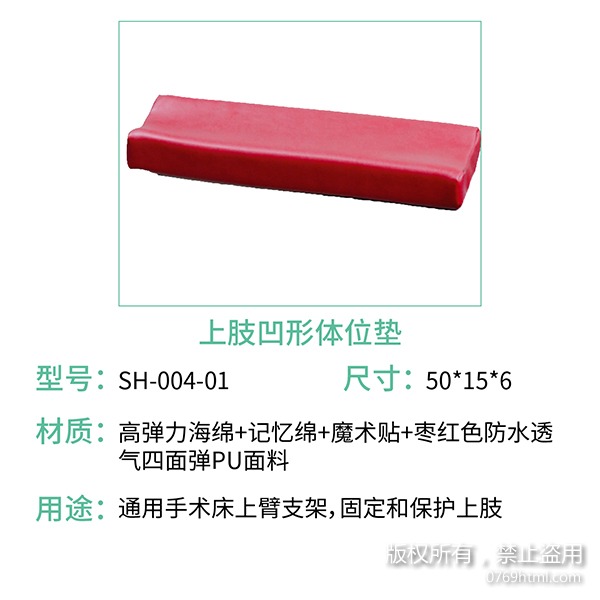 蒙泰護理凹形體位墊有上肢用凹形體位墊們也有下肢用凹形體位墊,選用棗紅色四面彈面料,防水透氣,海綿選用高彈力海綿和記憶棉組合拼接,既能做到支撐也能達到減壓效果。上肢凹形體位墊通用于手術床上臂支架,固定和保護上肢。下肢凹形體位墊俯臥位時支撐保護膝關節。